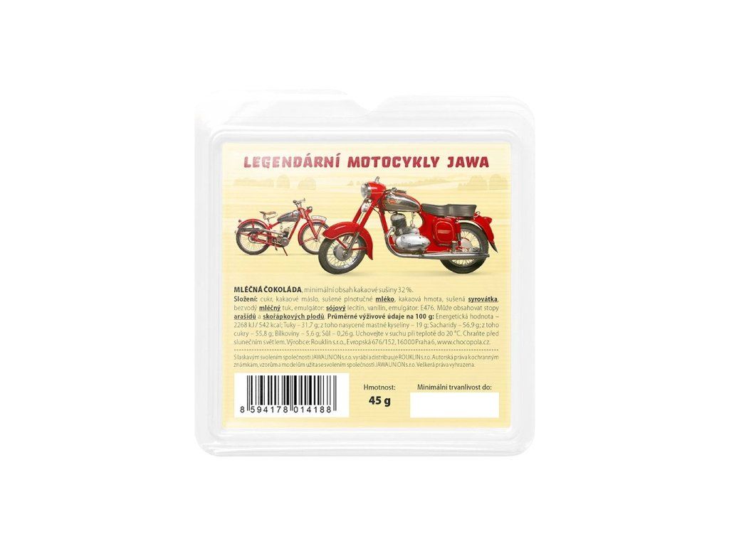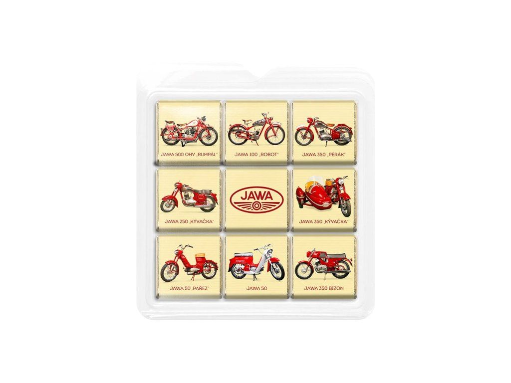 Sada devíti mini čokolád (9×5 g) s motivy legendárních motocyklů JAWA v průhledném blistru - dokonalý dárek pro všechny nadšence do motocyklové historie.