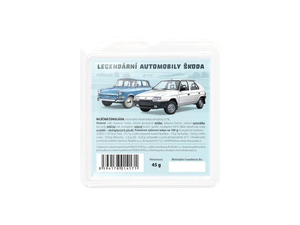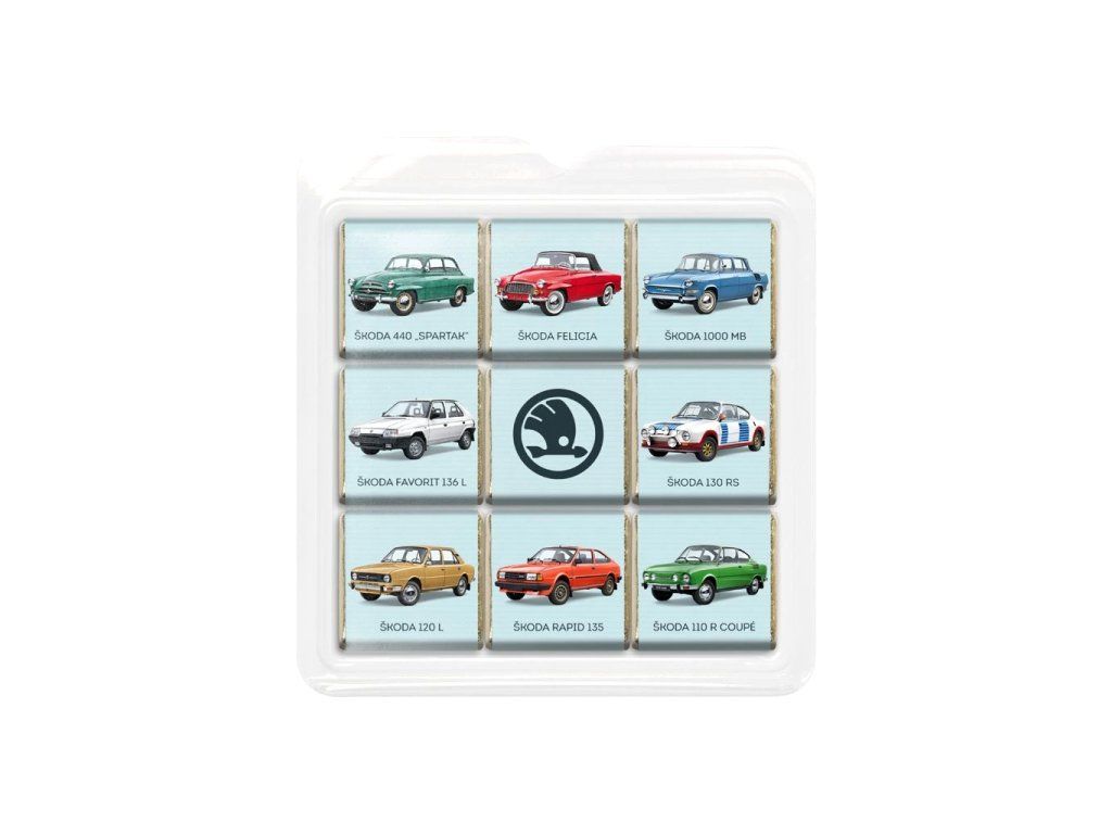 Mini čokolády inspirované tradicí značky Škoda – sada devíti kousků (9×5 g) s retro designem v praktickém balení.
