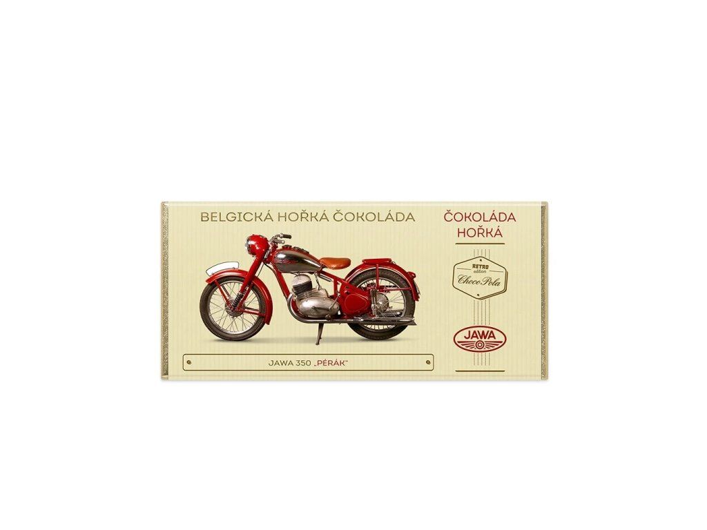 Belgická hořká čokoláda s retro motorkou JAWA 350 Pérák. JAWA 350 typ 18 Pérák přišel v roce 1950 s vylepšením původního motocyklu Jawa-Ogar typ 12. Motocykl je vybaven dvouválcovým motorem o obsahu 350 ccm. Výroba byla ukončena v roce 1956.