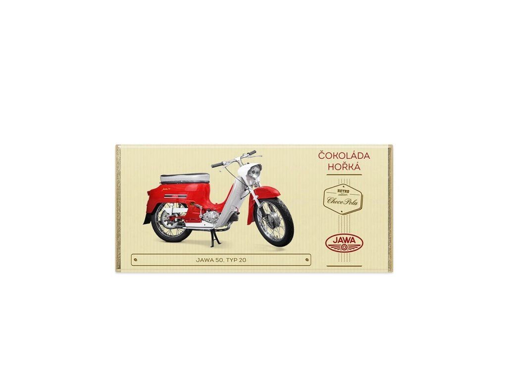 Ikonický Pionýr - Jawa 50, typ 20 na obalu hořké belgické čokolády. Jawa 50 typ 20 je lehký oskútrovaný dvoumístný motocykl lehké silniční konstrukce s jednoválcovým dvoudobým zážehovým motorem o objemu 50 ccm. Motocykl byl vyráběn v podniku Povážské strojárne n.p. v letech 1966–1980. Konstrukční rychlost 60 km/hod.
