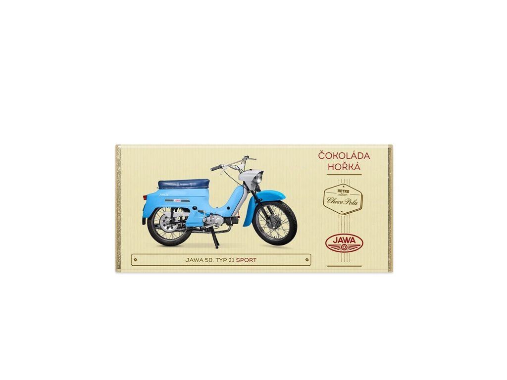 Hořká tabulková čokoláda s motocyklem Jawa 50 Sport na obalu je prima inspirací na dárek. Jawa 50 typ 21 Sport je lehký kapotovaný dvoumístný motocykl lehké silniční konstrukce s jednoválcovým dvoudobým zážehovým motorem o objemu 50 ccm. Jedná se o odlehčenou (sportovní) variantou modelu Jawa 50 typ 20. Motocykl byl vyráběn v podniku Povážské strojárne n.p. v letech 1967–1977. Konstrukční rychlost 60 km/hod.