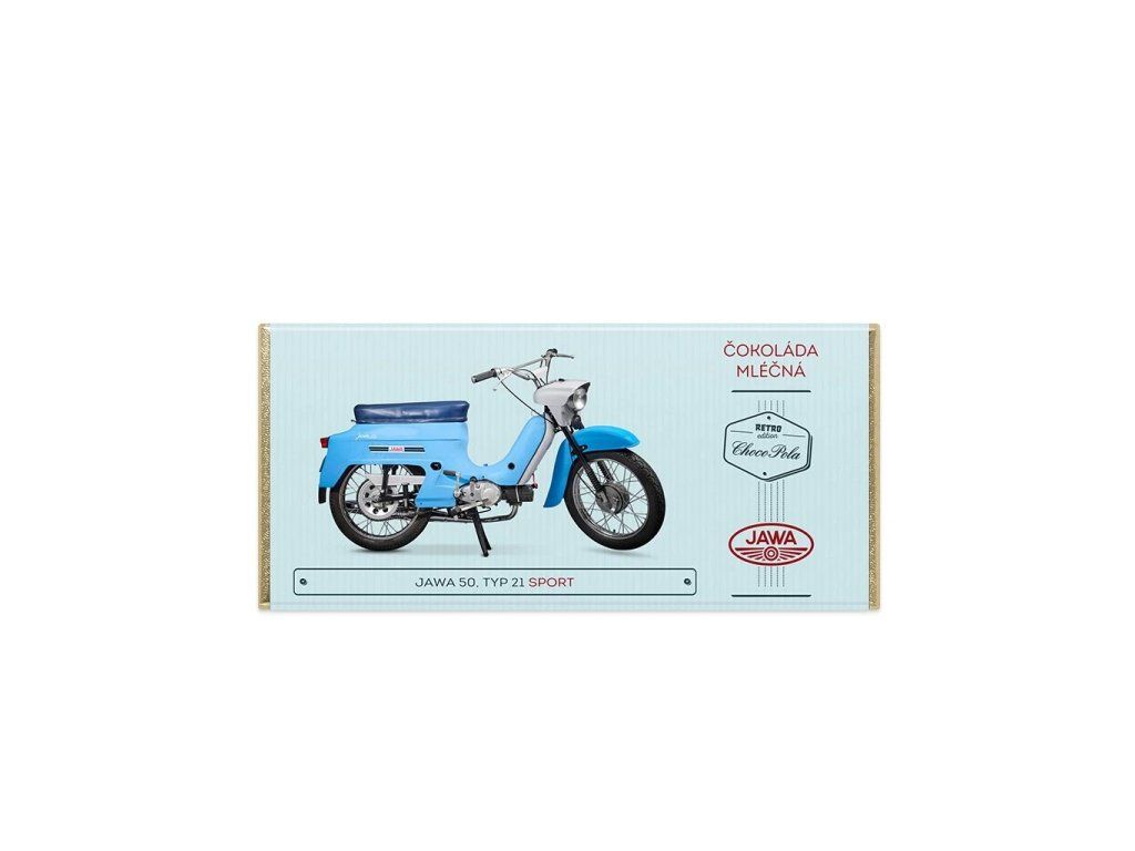 Mléčná tabulková čokoláda s motocyklem Jawa 50 Sport na obalu je prima inspirací na dárek. Jawa 50 typ 21 Sport je lehký kapotovaný dvoumístný motocykl lehké silniční konstrukce s jednoválcovým dvoudobým zážehovým motorem o objemu 50 ccm. Jedná se o odlehčenou (sportovní) variantou modelu Jawa 50 typ 20. Motocykl byl vyráběn v podniku Povážské strojárne n.p. v letech 1967–1977. Konstrukční rychlost 60 km/hod.