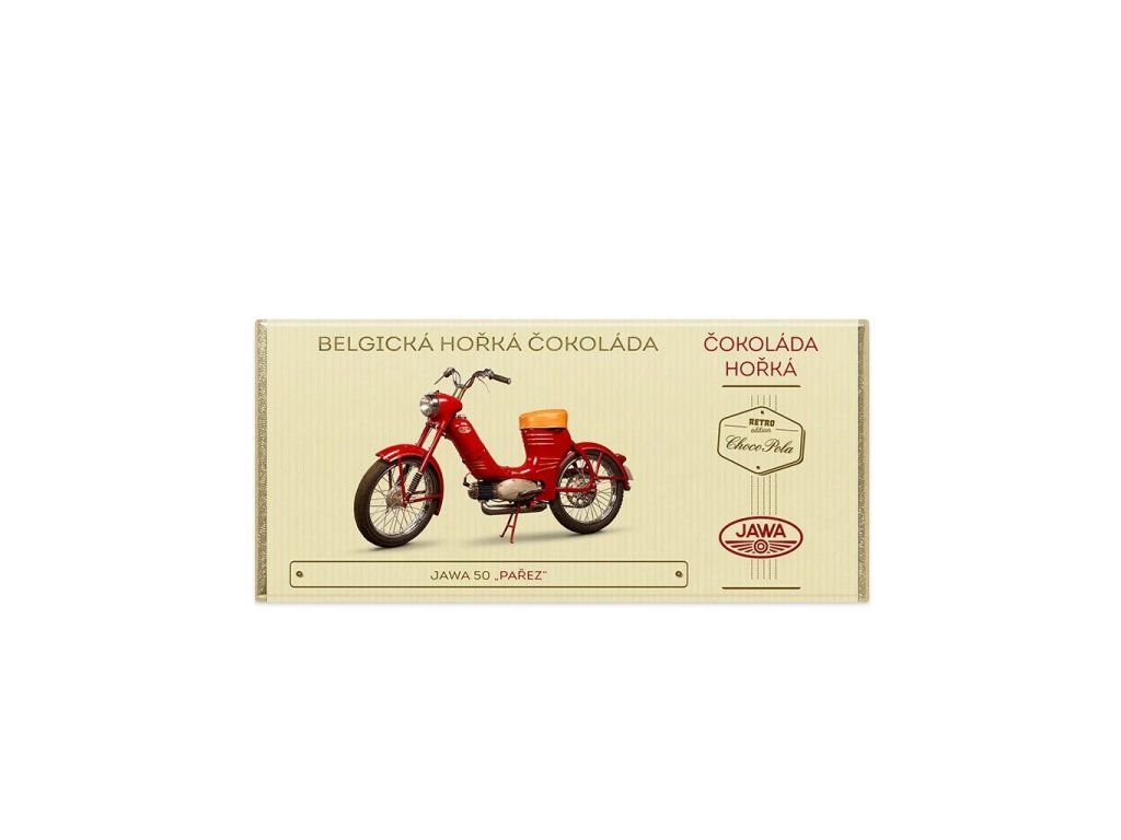 Originální hořká retro čokoláda v obalu s motivem motocyklu JAWA 50, typ 550 Pionýr. Tento motocykl je pro tvar sedla přezdíván Pařez. Jedná se o jednomístný motocykl lehké konstrukce s jednoválcovým dvoudobým motorem o zdvihovém objemu 50 ccm. Byl vyráběn v letech 1955–1958.