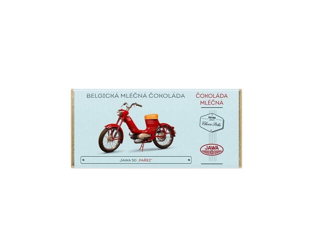 Originální mléčná retro čokoláda v obalu s motivem motocyklu JAWA 50, typ 550 Pionýr. Tento motocykl je pro tvar sedla přezdíván Pařez. Jedná se o jednomístný motocykl lehké konstrukce s jednoválcovým dvoudobým motorem o zdvihovém objemu 50 ccm. Byl vyráběn v letech 1955–1958.