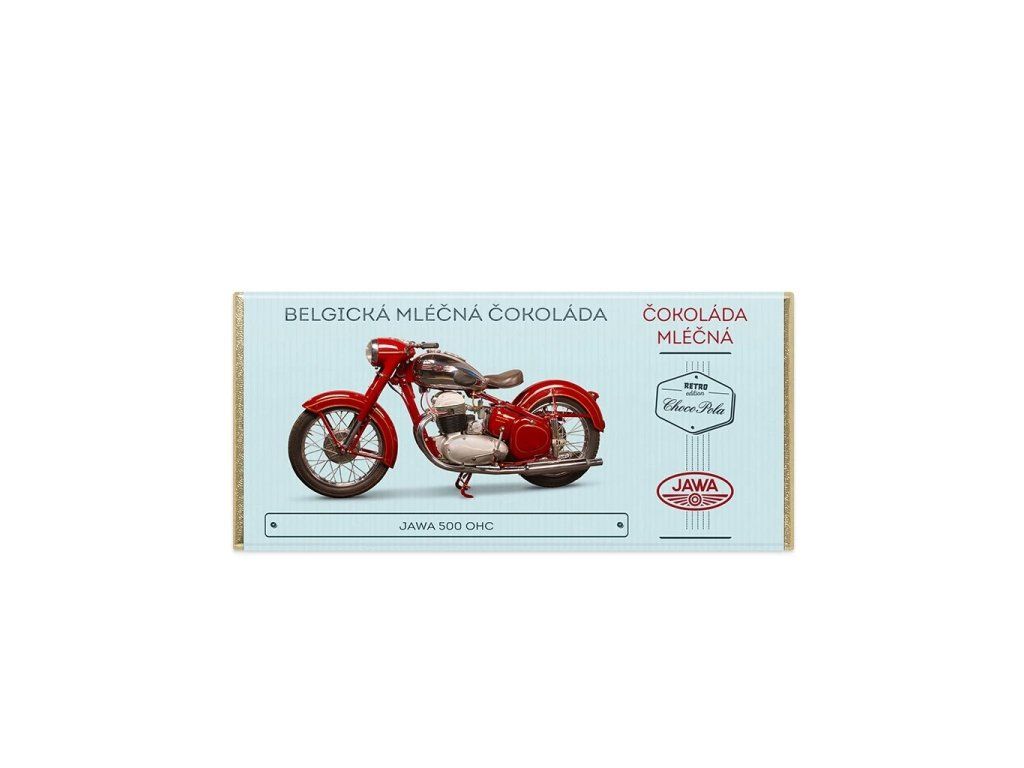 Pořádná mašina na výtečné čokoládě. Vychutnejte si belgickou mléčnou čokoládu s motivem motocyklu JAWA 500 OHC. Jawa 500 OHC je čtyřdobý, dvouválcový, vzduchem chlazený motocykl. Vyráběný byl v letech 1952–1958 ve třech verzích.