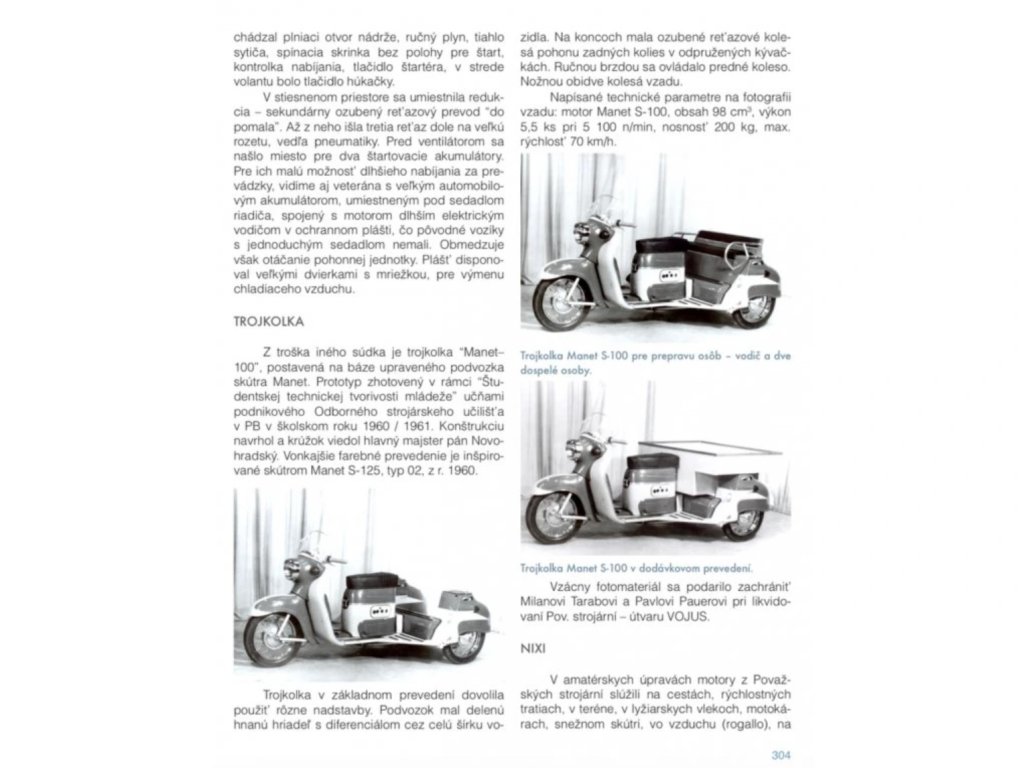 Kniha také přehledně zpracovává zrod a vývoj kategorie skútrů v zahraničí i v bývalém Československu, včetně popisu tvrdé konkurence na světovém trhu a inspirace zahraničním vzorem, od kterého se vývoj odvíjel. Zájemce potěší detailní technická část: dokumentace motoru Manet S-100 obsahuje těžko dostupné údaje k uložení klikového mechanismu pro opravy a věnuje se i složitější elektroinstalaci, která usnadní údržbu.