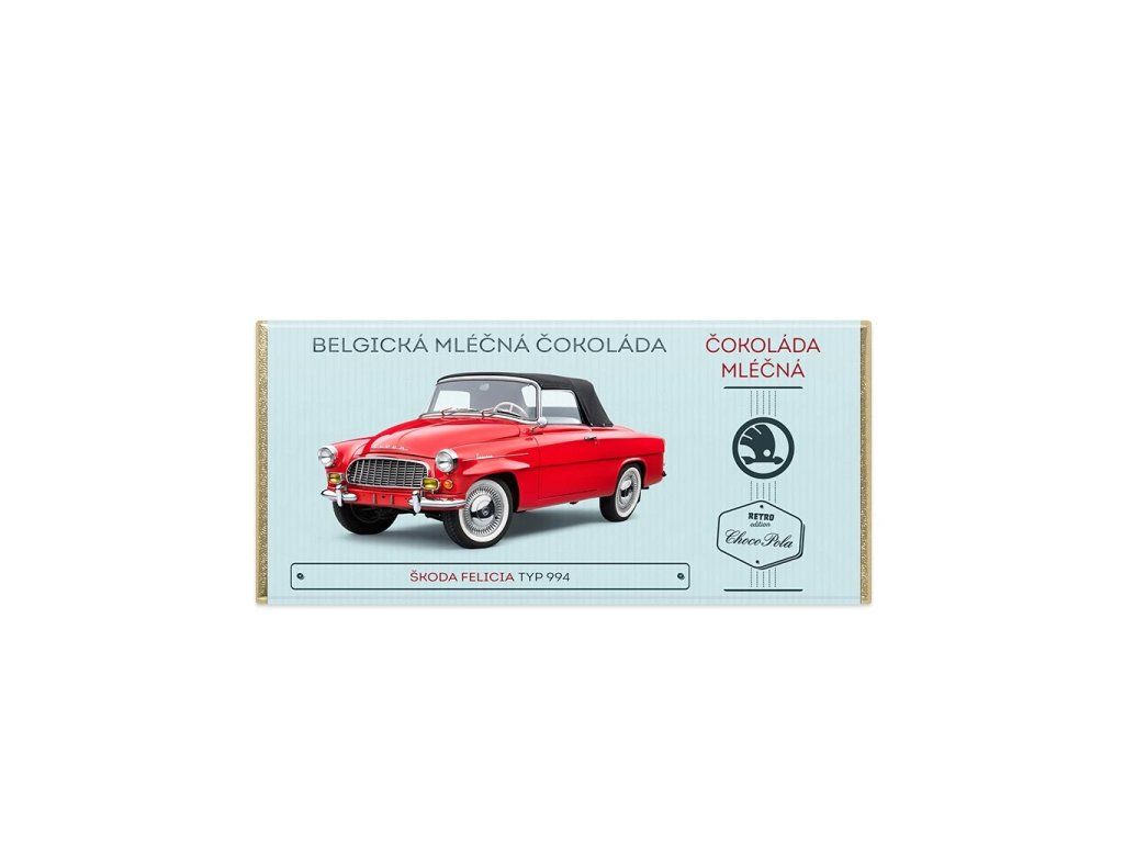 Mléčná čokoláda s motivem Felicie jistě zaujme každého, kdo má rád stará auta. Obdarujte přítele, manžela, tatínka, nebo dědečka originálním dárkem. Felicia (typ 994) je sportovní kabriolet s textilní sklápěcí, nebo pevnou sklolaminátovou střechou. Vůz byl vyráběn v letech 1959–1964 a byl určen převážně pro export.