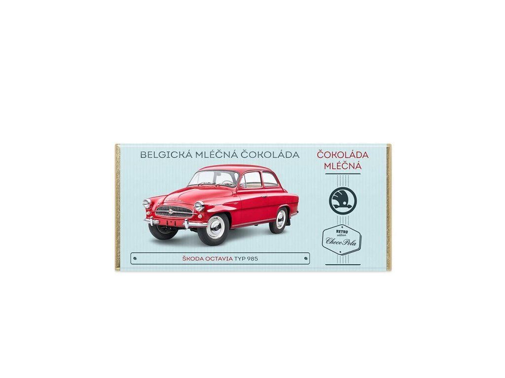 Červené Octavii to na retro obalu mléčné čokolády obzvlášť sluší. Dodnes používané jméno Octavia bylo poprvé použito v roce 1959 pro nástupce úspěšného modelu Škoda 440. Na svou dobu byla Škoda Octavia (typ 985) levný, spolehlivý a dobře ovladatelný vůz. Jednalo se o řadový čtyřdobý čtyřválec 1,1 l / 29,4 kW, který přes čtyřstupňovou převodovku poháněl zadní kola. Octavia se vyráběla v letech 1959–1971. Model na obalu je z roku 1959. Krásný veterán z šedesátých let na obalu výtečné belgické čokolády je naším tipem na bezva dárek.