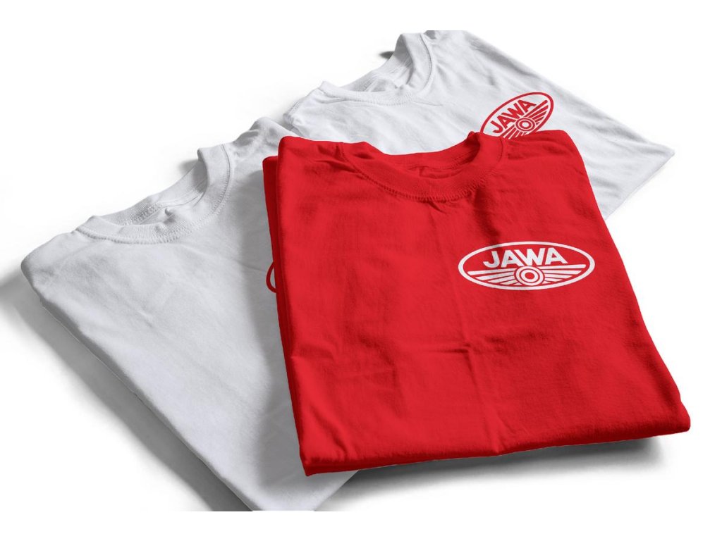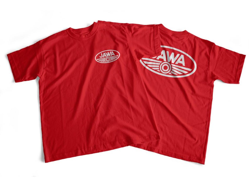 Červené bavlněné tričko s potiskem loga JAWA na srdci na zádech. Logo JAWA je na tričku natisknuto semišovým „chlupatým“ termotransferovým flock potiskem.